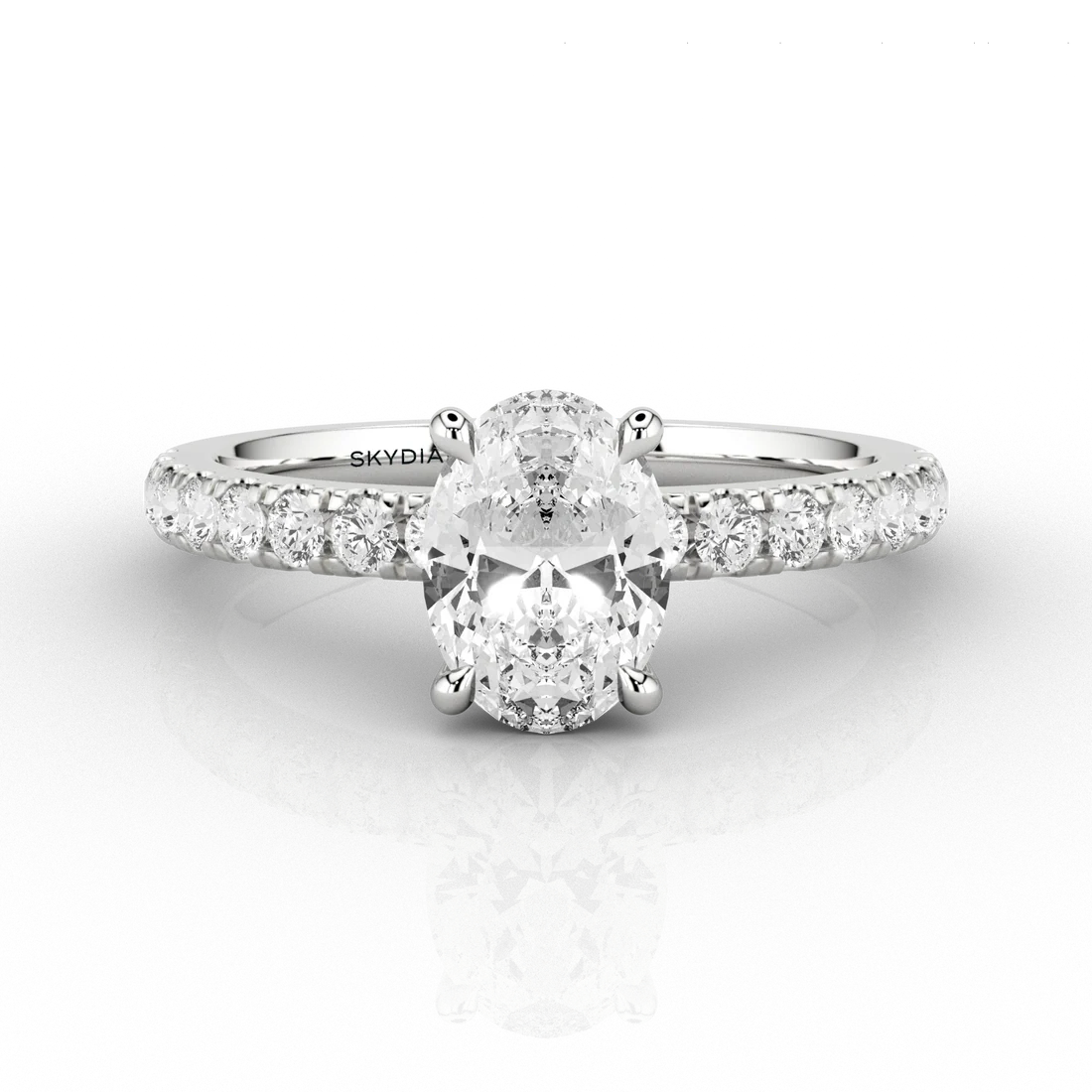 This Sky Contemporary ring is set with an Oval Skydiamond on a sleek pave recycled platinum band. The four talon claws hold it securely and elevates it above the finger. This design allows the Skydiamond to catch the light from every angle with the additional bounced brilliance from the surrounding pave which fits perfectly back with your wedding band – we recommend an eternity wedding band to complete this dazzling look. This talon-claw set Skydiamond centre stone weight is 0.69 Carats and with the pave, total weight is 1.01 Carats