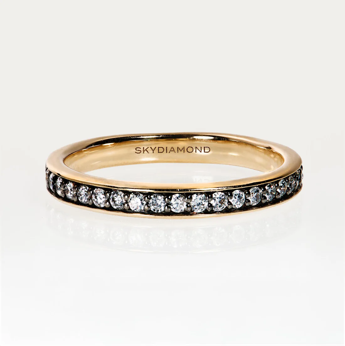 A refined interpretation of timeless commitment, the Double Love Eternity Ring is designed to stack effortlessly alongside statement jewellery. Crafted from recycled 18ct yellow gold, its minimalist design is adorned with delicate grain-set Skydiamonds on half the band, in deep black rhodium, offering a bold yet elegant contrast. With a total lab-grown diamond weight of 0.25ct, this ring is a modern interpretation of a classic symbol – an everlasting promise, crafted from the sky and made to endure forever.